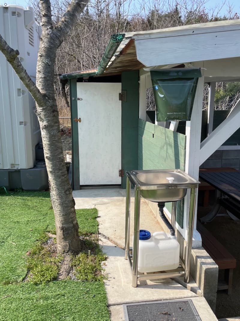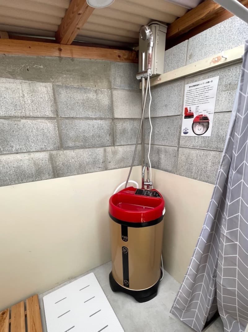 温水シャワーは貯水式となっていますので、ご使用の前には水が溜まっているか確認し、無ければポリ缶から適量の水を溜め注意書きを要確認の上ご使用ください。