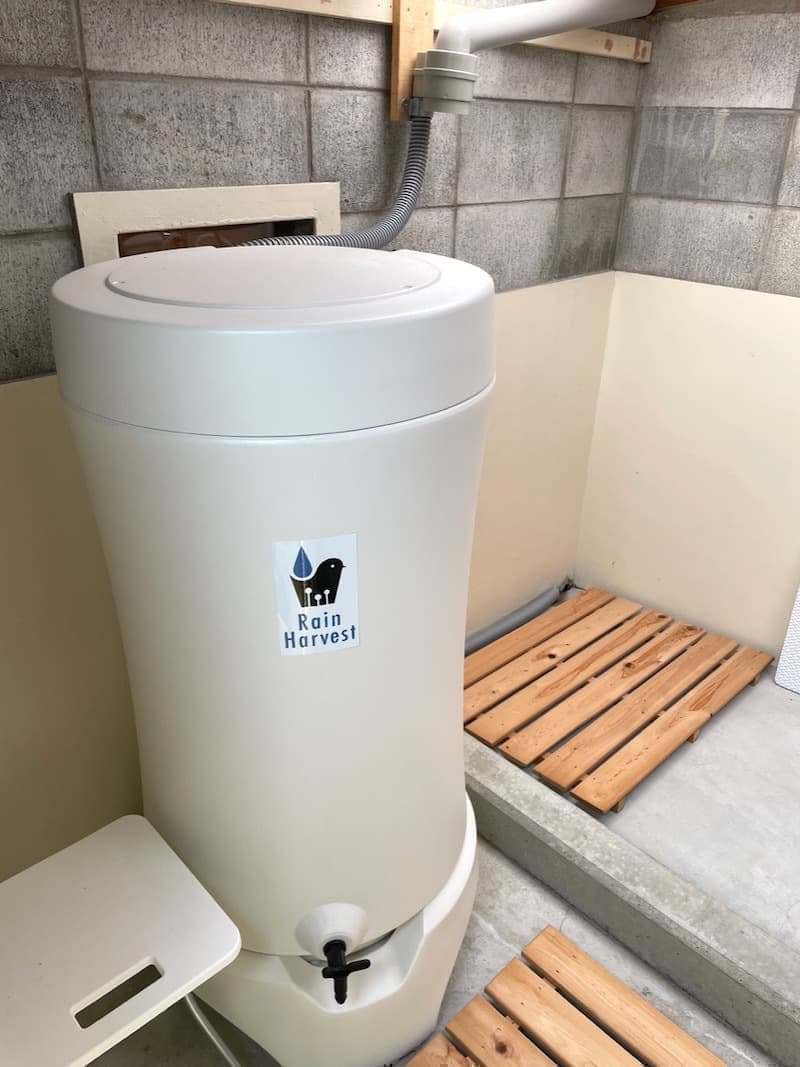 脱衣所内の雨水貯水タンクは、足を洗ったり飲み水以外に必要な時バケツに汲んでお使いください。