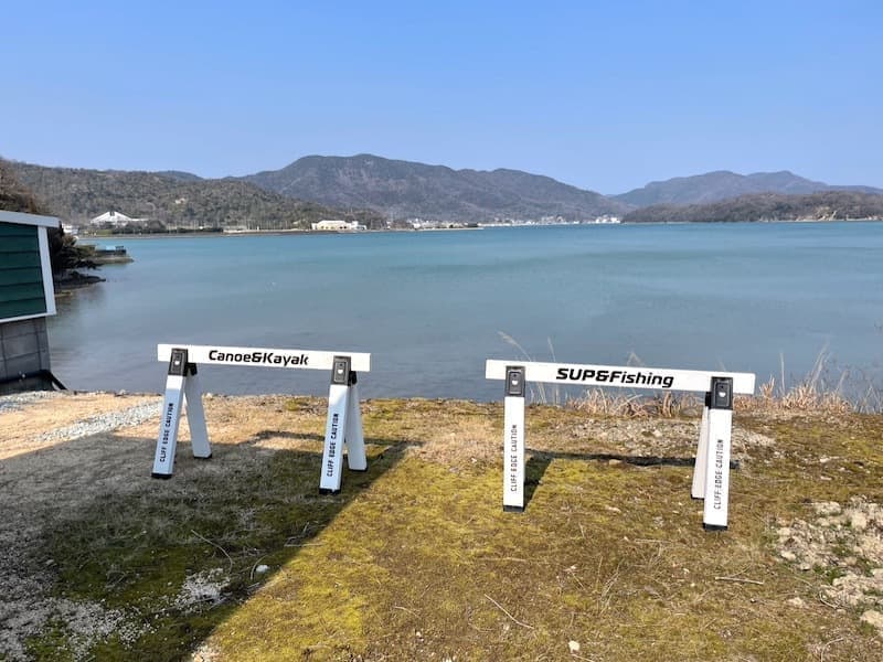カヤックやカヌーを降ろす際は、場外の決められた場所から、上と下で2人以上で気をつけて降ろしてください。
