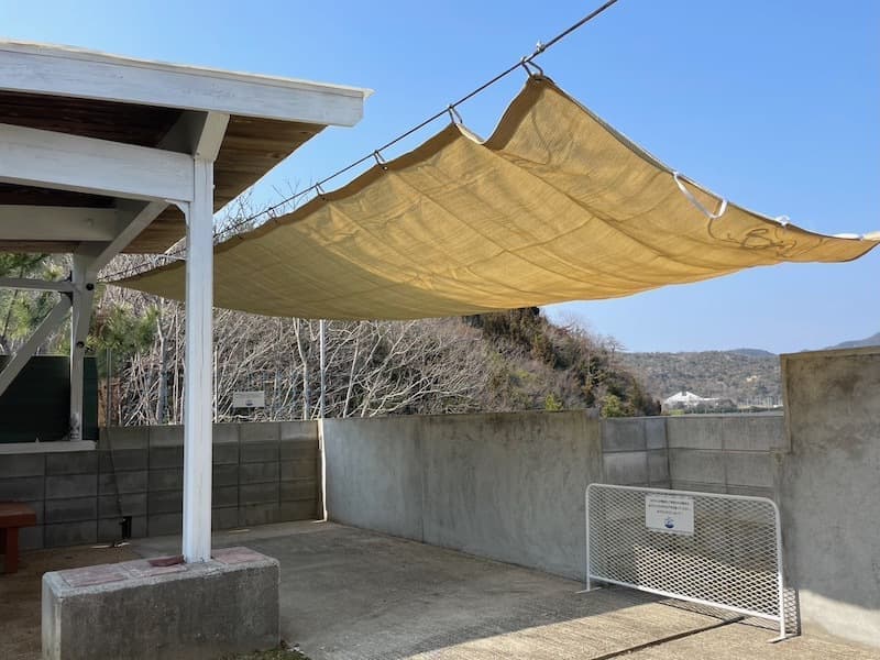 日差しのきつい時はオーニング(日除け幕)を伸ばして脱衣所のビスにカラビナを刺してお使いください。